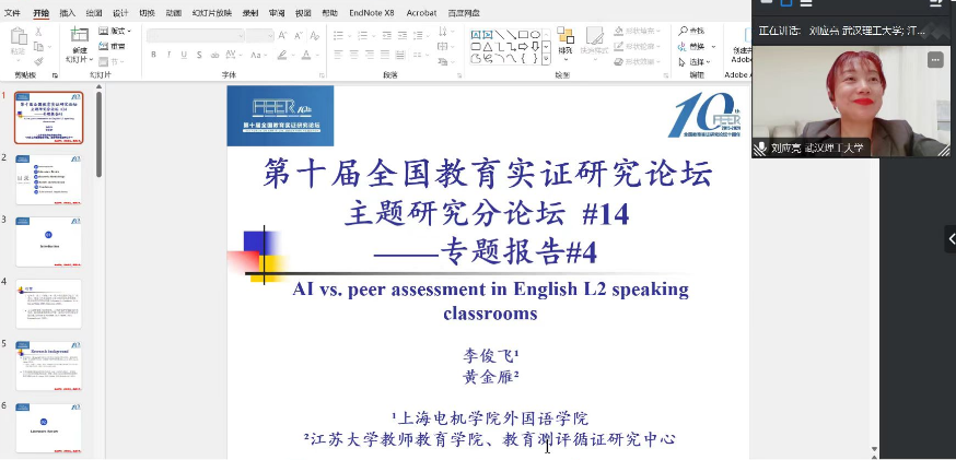 On November 4th, the sub-forum, “Research on Generative Artificial Intelligence and Language Assessment – Multivariate Generalizability Theory Approach”, part of the 10th Forum on Empirical Education Research, was successfully conducted in Room 1806 of the Sanjiang Building at Jiangsu University. This event was hosted by East China Normal University and organized by the School of Teacher Education and the Evidence-Based Education Assessment Research Center of Jiangsu University. The conference was held in a hybrid format, integrating online and in-person participation.