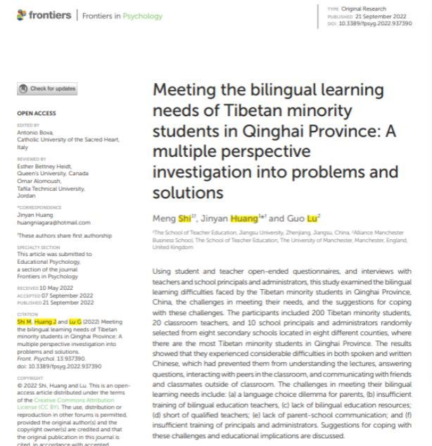 Dr. Shi Meng (first author) and Professor Huang Jinyan (co-first author and corresponding author) jointly published a research paper entitled "Meeting the bilingual learning needs of Tibetan minority students in Qinghai Province: A multiple perspective investment into problems and solutions" (DOI: 10.3389/fpsyg. 2022.937,390) on the international academic journal Frontiers in psychology: Educational psychology.