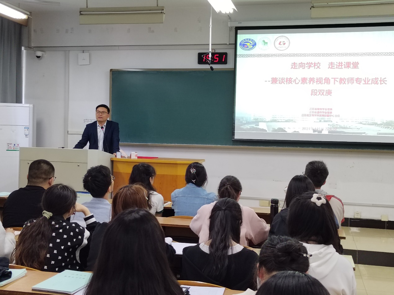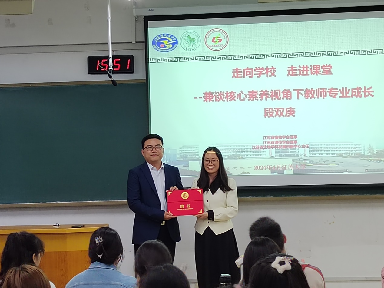 第二阶段,段双庚做 “走向学校,走进课堂——兼谈核心素养视角下教师专业成长”的主题讲座。他详细介绍了新课程、新教材和新高考方案,阐述了核心素养下教师发展的重新定位以及班主任角色转变,分享了大港中学的文化建设及德育教育。讲座结束后,李霞向段双庚赠送讲座聘书。