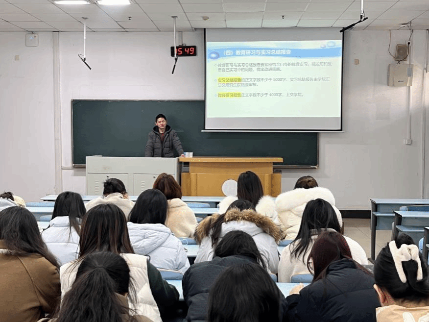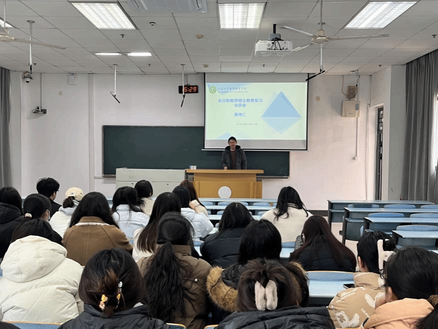 在三江楼附楼201教室举行2023级全日制教育硕士教育实习动员会。会议由教育硕士教育中心蔡伟仁老师主持,专硕2301班与专硕2302班全体同学参加。