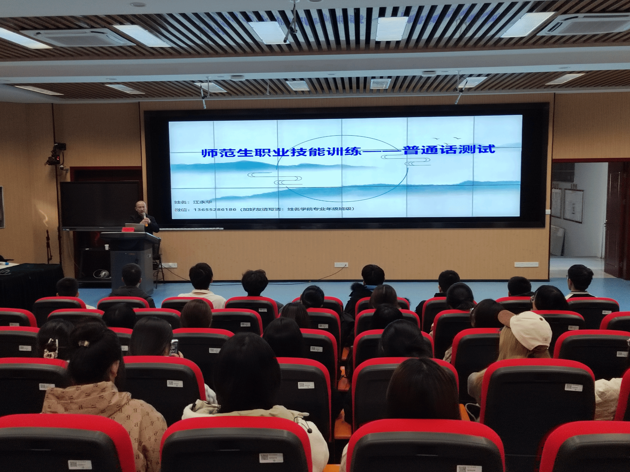 、艺术学院,在主A楼201举办普通话测试指导讲座。本次讲座邀请求知书院党总支书记江永华主讲,师范教育中心办公室副主任尹华和各专业本科师范生参加。讲座由物理学(师范)2102班王猛主持。