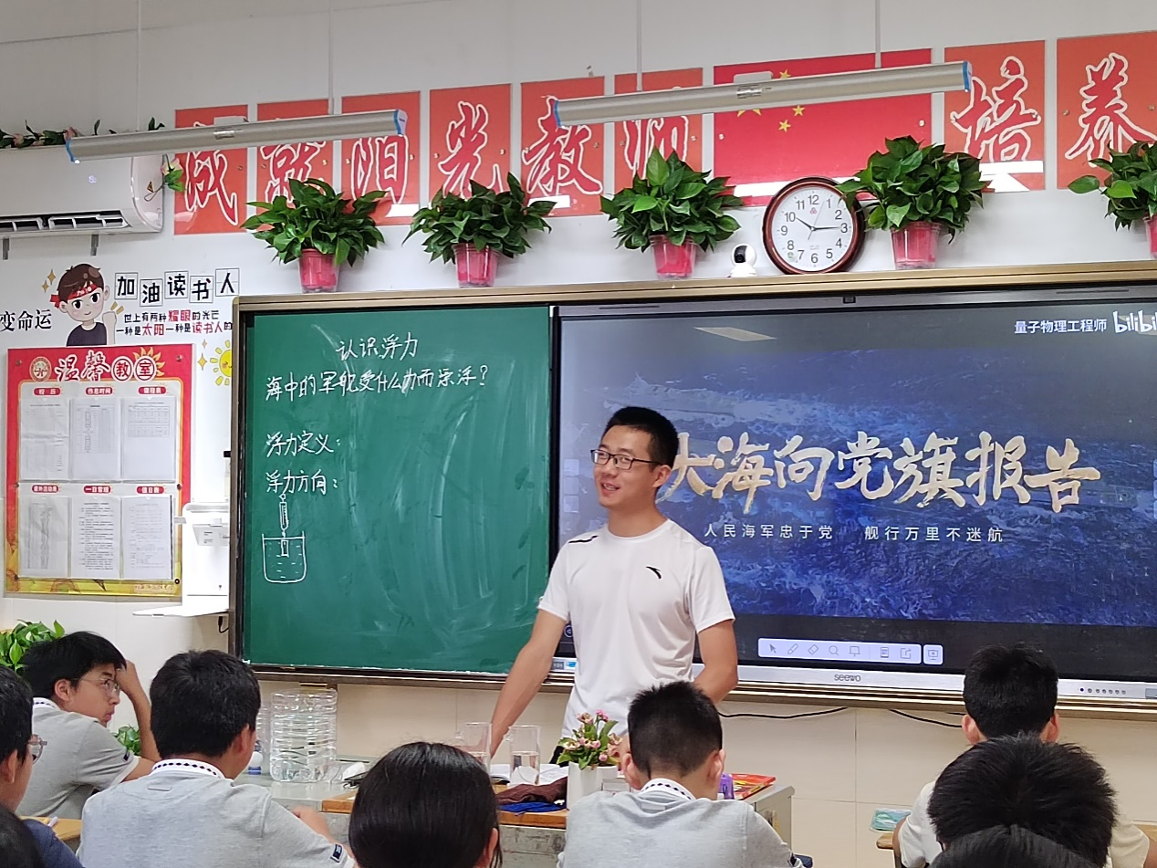 句容市华阳中学副校长杨树兵带领海角网 调研团老师参观校园,并一起走进八(1)班听评课,观摩物理学(师范)专业实习生柯更晰的讲课。