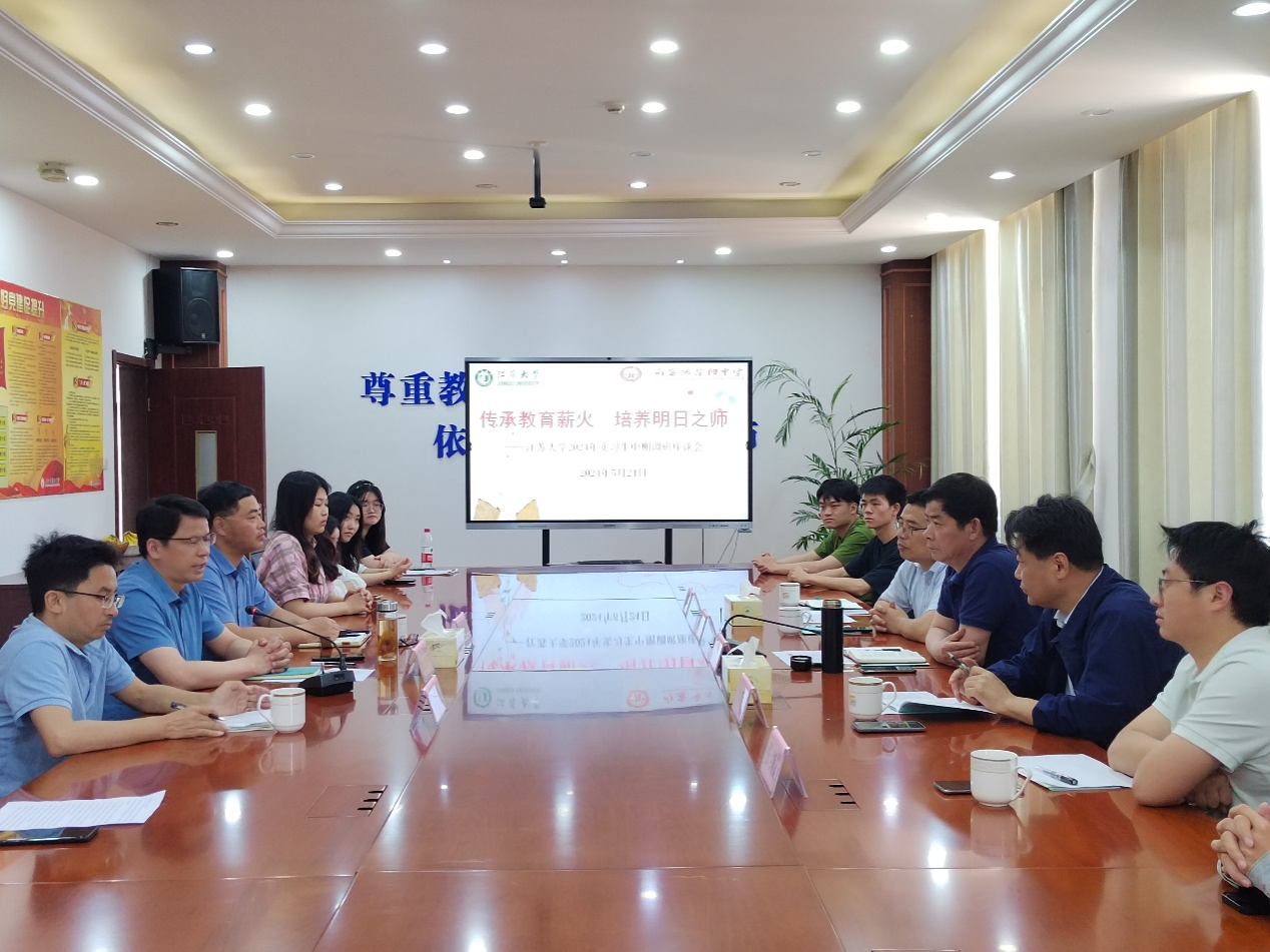 句容市实验高级中学党委书记汪涛、校长薛国强、副校长曾玮、指导教师代表和全体实习生参加调研座谈会。实习生分享了实习期间与高中生同步作息对体能的挑战,上课后获得学生好评的成就感,实习过程累并快乐着。蒋俊明代表海角网 感谢句容市实验高中给予实习生锻炼成长的机会,看到同学们的成长变化,鼓励同学们要拿出百分百的诚意,跟中学指导老师习得真本领,扎实基本功。座谈会后,双方就加强师范专业建设、师范生就业等方面进行了研讨。