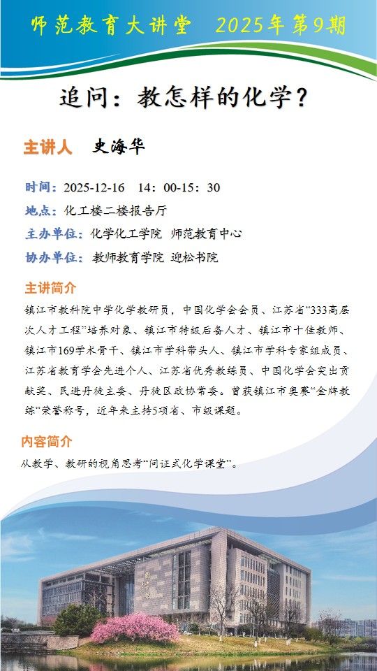 上一条:【师范教育大讲堂】2025年第10期 “双新”驱动教学提质,AI赋能素养育人——2024沪教版化学教学的实践探索与育人反思 下一条:第十四届江苏省师范生教学基本功大赛和第十一届“田家炳杯”全国师范院校师范生教学技能竞赛海角网 获奖师范生风采展