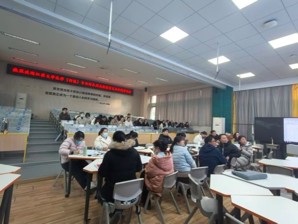 课后,师范生代表还参与了评课研讨活动,观摩了镇江外国语化学组老师的集体备课活动。同学们结合所学理论知识,积极发言、交流体会,在思维碰撞中深化对教学设计、课堂管理与学生互动的理解。外国语学校化学教研组教师也参与指导,分享教学经验与育人思考,为师范生提供了宝贵的实践指引。